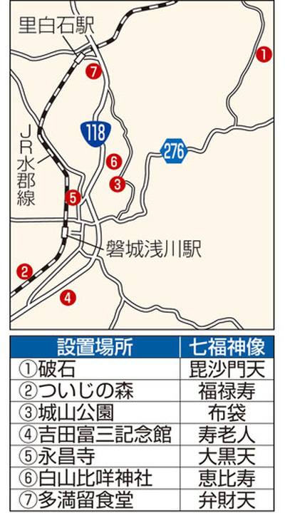 実行委の発起人は、町内で働く清家(せいけ)栄治さん(52)=須賀川市=だ。清家さんは七福神巡りが趣味で、七福神を目当てに県内外を旅している。しかし、中通りには七福神を巡れる場所がなく「浅川町にも七福神があればいいのに」と考えた。