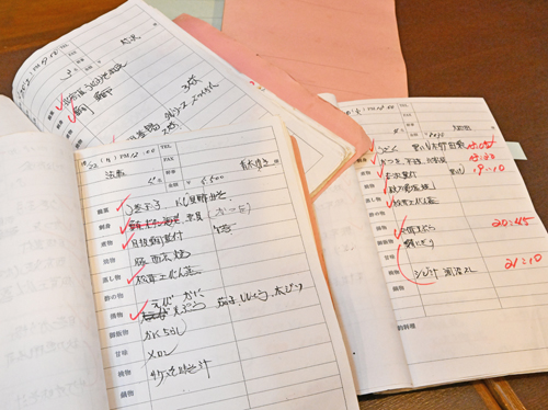 小沼徳男さんは客の献立表を紙にまとめている。年ごとにファイルにまとめ、現在23冊目。手書きで利用目的や献立、料理を出した時間などを記している。「前回とメニューがかぶったりしないように。祝い事などで失敗しちゃいけないから、こちらも気を使わなきゃね」