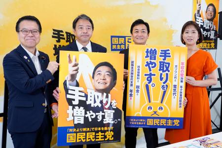 国民民主党の玉木雄一郎代表は17日、記者会見し、参院選公約を発表した。所得税が生じる「年収の壁」を巡り所得制限を設けない178万円への引き上げを主張。消費税率は実質賃金が持続的にプラスになるまで一律5%に引き下げるとした。「手取りを増やす夏。」と銘打ち、現役世代の可処分所得増加に照準を合わせた。
