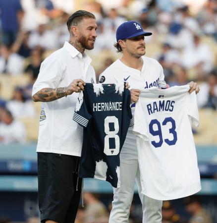 【ロサンゼルス共同】サッカーの元スペイン代表DFで、同国の強豪レアル・マドリードで長年活躍したセルヒオラモスが18日、ロサンゼルスで行われたドジャース―パドレスの試合前に始球式を務めた。マウンドから捕手役のE・ヘルナンデスを相手に、ノーバウンドで投げ込んだ。