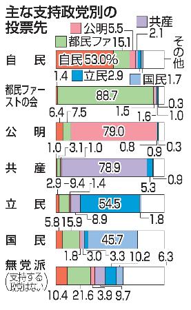 都民ファは支持層の88・7%を固め、公明は79・0%、共産は78・9%、立民は54・5%、国民民主党は45・7%。自民支持層の15・1%は都民ファを投票先に選んだ。