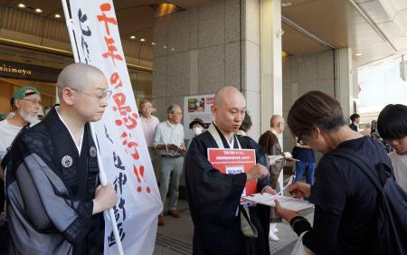 多くの買い物客らが訪れる四条河原町で、会に所属する僧侶や住民有志ら約30人がのぼりや署名用紙を手に呼びかけた。