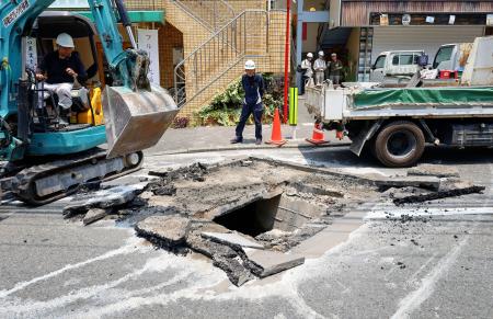 地中にある水路の床板が崩落し、アスファルトも陥没したとみられる。視察した武内和久市長は取材に「拡大させないことを最優先に、早急に復旧したい」と述べた。