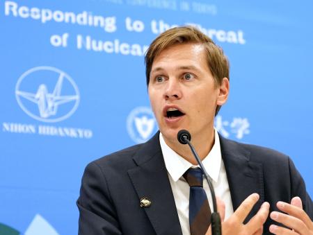 被爆80年で初来日しているノーベル賞委員会のフリードネス委員長(40)は27日、昨年平和賞を受賞した日本原水爆被害者団体協議会(被団協)のメンバーと上智大(東京都千代田区)で記者会見した。世界で核の脅威が高まり、「核のタブー」が脅かされていると強調し「地球上の全ての人々が核のタブーを維持するために貢献すべきだ。被爆者の声に耳を傾け、広島と長崎を訪れてほしい」と訴えた。