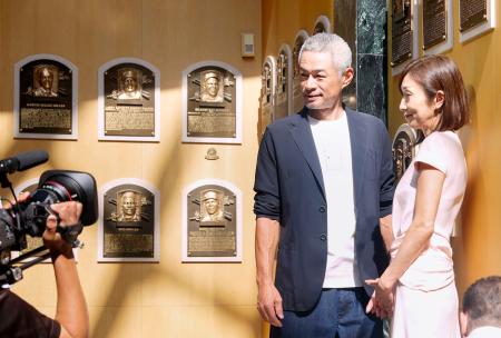 イチローさんはその後、殿堂に隣接するダブルデー・フィールドで米国野球殿堂のポッドキャストにゲスト出演。大受けだった前日のスピーチについて問われ「まず日本語で準備し、それを英語にしたが妻の能力がすごく高かった。妻でもあり、編集長でもあった」と振り返った。