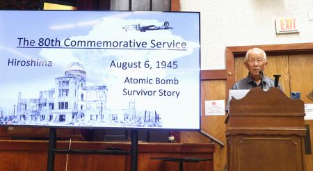 【ロサンゼルス共同】広島、長崎への原爆投下から80年を迎えるのに先立ち、米ロサンゼルスの日系人街リトルトーキョーの高野山米国別院で3日、原爆犠牲者の追悼法要が営まれた。被爆者で日系3世のハワード・カキタさん(87)は参列者を前に核兵器廃絶を呼びかけ「再び被爆者が生まれないことを願う」と訴えた。広島、長崎両市長もメッセージを寄せた。