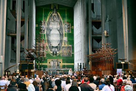 【コベントリー共同】広島への原爆投下から80年となった6日、英国の平和都市として知られる中部コベントリーの大聖堂で広島と長崎の原爆犠牲者を追悼する式典が開かれた。出席した市民ら約300人が折り鶴をつくって祈りをささげ「未来永劫、核戦争を起こさない」と誓った。