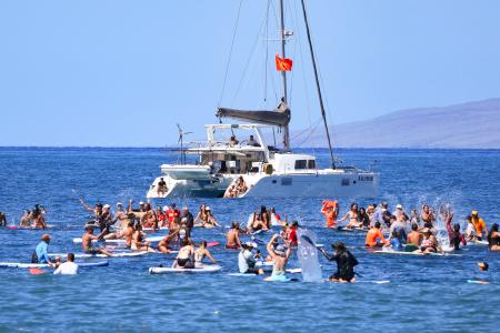 追悼儀式「パドルアウト」の参加者は、ビーチから約100m沖合の船へこぎ出し、海上で並んだ。旋回するヘリコプターから白や赤などのプルメリアの花びらがまかれる中、水をかき上げたり、歓声を上げたりした。