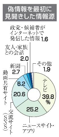 回答者が見聞きした偽情報は延べ1700件で、最初に見た情報源を尋ねたところ、テレビが最多の39・8%だった。テレビ各局がSNSの偽情報を検証するファクトチェックに力を入れたためとみられる。