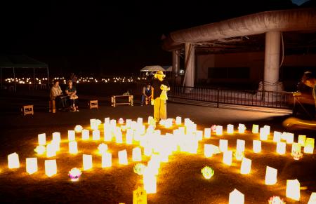 東日本大震災の津波で児童と教職員計84人が犠牲になった宮城県石巻市の大川小で16日、卒業生らでつくる一般社団法人「Team大川 未来を拓くネットワーク」がお盆に合わせ紙灯籠をともした。中庭には当時の在校児童数と同じ108個が並べられ、亡き友に思いをはせた。