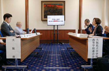 大阪府は22日、所得制限のない高校授業料無償化を巡り、私学団体と府庁で意見交換した。公費負担上限の超過分を私学側が賄い保護者負担をゼロにする制度について、団体は現行上限の年間63万円では物価高騰に対応できないとして支援拡充を要望。吉村洋文知事は「教育の質を高めるため、さまざまな方策を考える」と見直しに言及した。