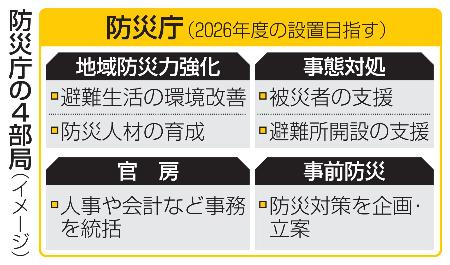 防災庁設置の政府案によると、「地域防災力強化」はボランティアや自治体などの連携や防災人材の育成を担う。「事態対処」は災害発生時に避難所や仮設住宅の開設支援、物資の調整を行う。防災対策を企画・立案する「事前防災」、人事や会計などの事務を統括する「官房」も設ける。