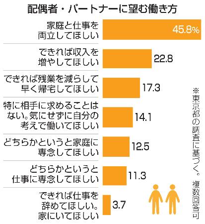 東京都が若者や子育て世代を対象に実施した意識調査で、配偶者やパートナーに望む働き方を複数回答で尋ねたところ「家庭と仕事を両立してほしい」との回答が45・8%で最も多かった。共働きを望まないとする回答は少数にとどまっており、都幹部は「子育て分野をはじめ、共働き世帯を支援する政策を考える必要がある」と指摘した。