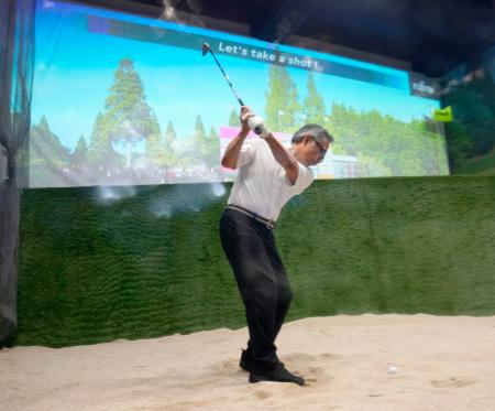 富士通はゴルファーのスイングをAIで分析し、上達に向けたアドバイスをする技術を紹介。現地にバンカーを設け、来場者が体験できるようにした。
