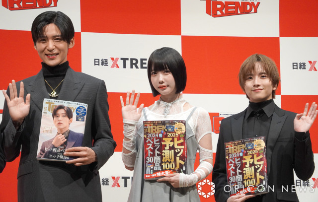 9人組グループ・Snow Manの目黒蓮、タレントのあのが10月31日、都内で行われた日経トレンディ『2024年ヒット商品ベスト30』『2025年ヒット予測100』先行発表会に登壇した。今年ブレイクした今年の顔として選出。また来年の顔として俳優の板垣李光人が登壇した。