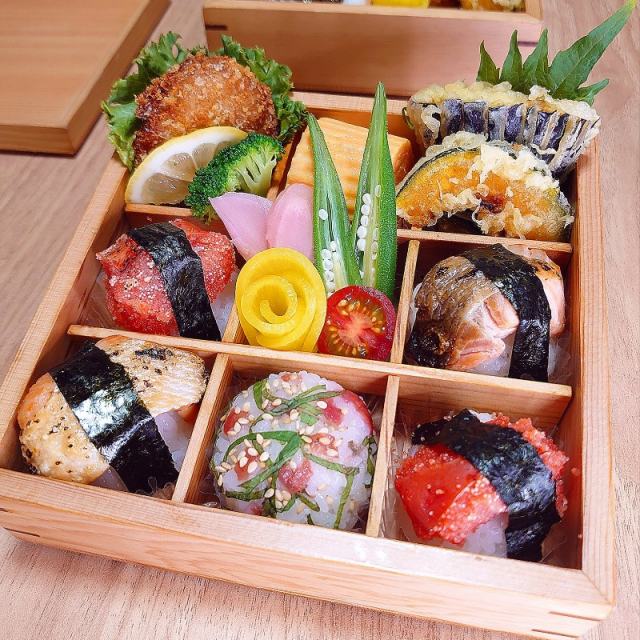 梅と大葉をあしらったおにぎり、のりを巻いた鮭、明太子のおにぎりのほか、「坊っちゃん南瓜と茄子が美味しい初夏」とミニサイズのかぼちゃの天ぷらのほか、卵焼き、唐揚げ、プチトマトなどが盛り付けられている。