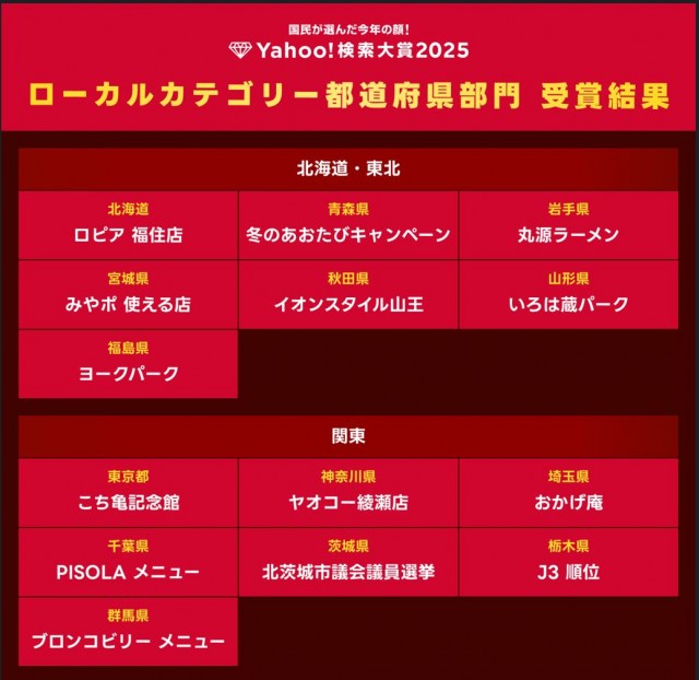 【画像】「Yahoo!検索大賞2025」ローカルカテゴリー都道府県部門の結果(一覧)