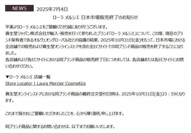 コスメブランド「ローラ メルシエ」が今年10月31日をもって、日本市場から撤退する。公式サイトで発表した。資生堂ジャパンが日本代理店を務めている。