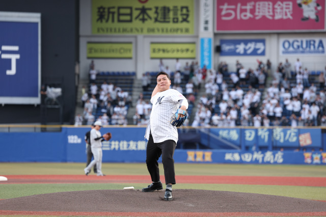 元千葉ロッテマリーンズの金泰均さんが27日、千葉・ZOZOマリンスタジアムで行われた福岡ソフトバンクホークス戦の始球式に登場した。