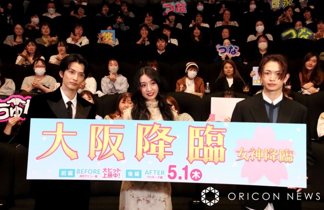 俳優のKoki,(22)、渡邊圭祐(31)、綱啓永(26)が22日、大阪市内で開かれた映画『女神降臨 Before 高校デビュー編』(公開中)舞台あいさつに登壇した。