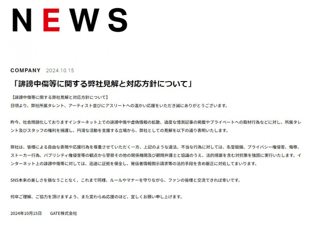タレントのベッキーやお笑いコンビ・ハリセンボンらが所属する芸能事務所「GATE」が15日、誹謗中傷に対する見解と対応方針のメッセージを公開した。