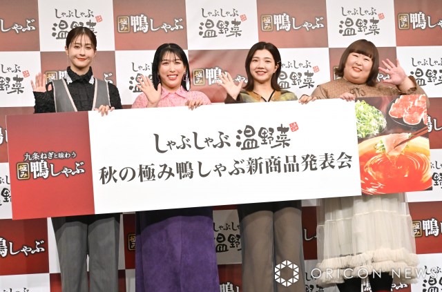俳優の松本若菜、お笑いトリオ・3時のヒロイン(福田麻貴、ゆめっち、かなで)が1日、都内で行われた『しゃぶしゃぶ温野菜 秋の極み鴨しゃぶ新商品発表会』に登場した。