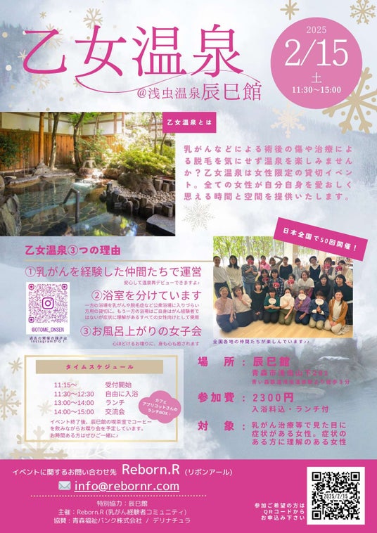 はたらく女性を応援し、配達弁当事業「デリナチュラ」を運営する、青森福祉バンク株式会社(本社:青森市浜田豊田148-6/代表取締役:白石直之)は、乳がんを経験し手術の傷跡や脱毛が気になる女性たちが公衆浴場での入浴をきっかけに新たな一歩を踏み出すための入浴イベント『乙女温泉』を主催するReborn.R(リボンアール 所在地:兵庫県尼崎市、代表:渡辺愛)と共催して、『乙女温泉』を2/15(土)に青森市の浅虫温泉の旅館「辰巳館」で開催することを決定いたしました。