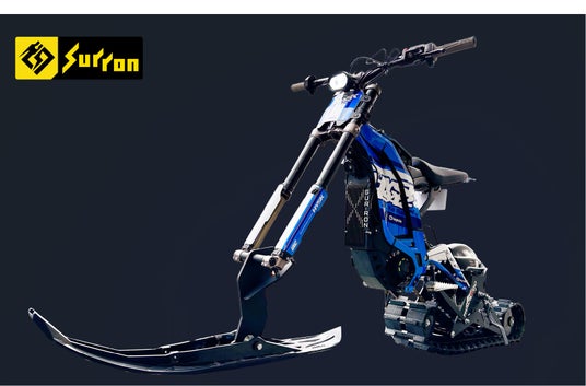 e-スノーバイクとは、EV-バイクとして、デザインと性能の両面で世界的に高い評価を受けている、また当社取扱商品でもある「Sur-ron」をベースに、カナダ製「TRACKN GO」を装着したものです。TRACKN GOとは、前輪にスキー、後輪にクローラーを採用したアタッチメントキットです。