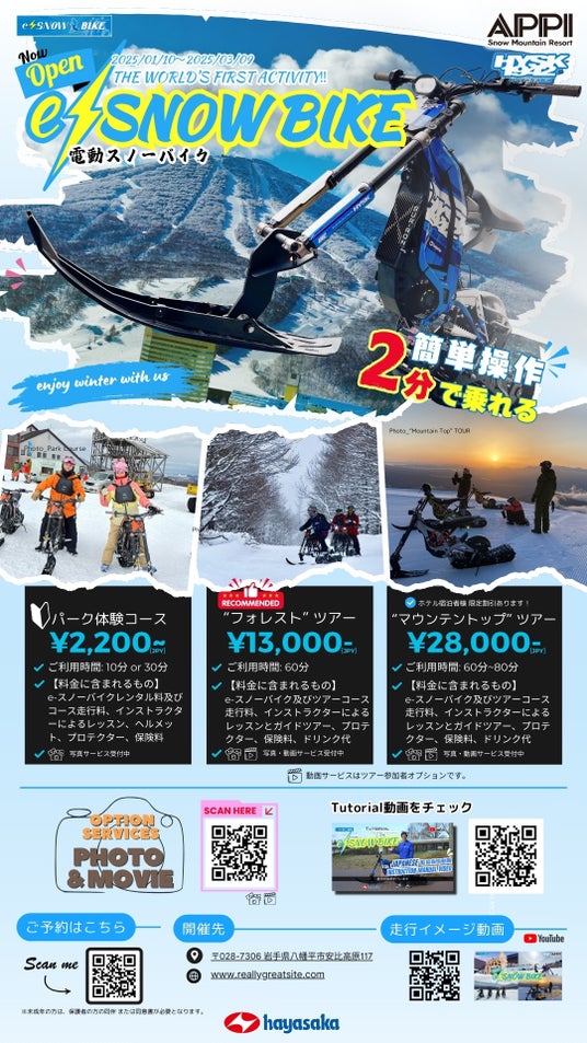 自転車・オートバイを販売および修理する「ハヤサカサイクル」を運営する株式会社早坂サイクル商会(本社:宮城県仙台市、代表取締役:早坂 武)は岩手県安比高原スキー場にて、冬のスキー場×バイクというこれまでの常識を覆す、全く新しいウィンターアクティビティの体験会を2025年1月10日から3月9日まで行います。