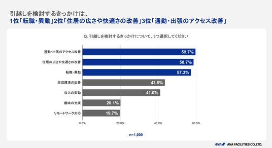 また、引越しの実施・検討のきっかけを尋ねたところ、最も多くの回答が集まったのは「通勤・出張のアクセス改善」で、次いで「住居の広さや快適さの改善」「転職・異動」という結果となりました。交通の便と自室の快適さを求めて引越す人が多いことがわかりました。