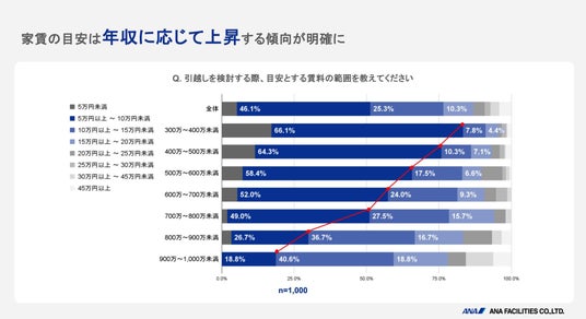 引越しを検討する際の家賃の目安を調査した結果、年収に応じて家賃が上昇する傾向が明らかになりました。全体では、「5万円以上~15万円未満」が主な価格帯である一方、年収が増加するにつれて「15万円以上」の価格帯を選ぶ人が増えています。
