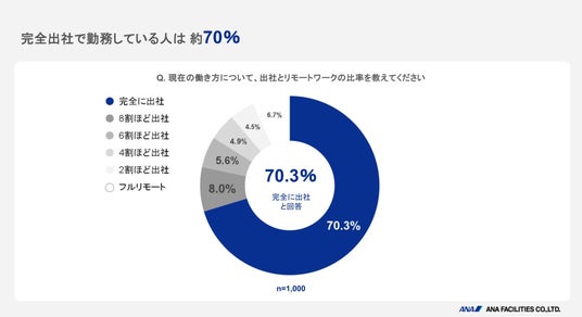 現在のワークスタイルについて、出社とリモートワークの比率を尋ねたところ完全出社と回答した人が約70%でした。