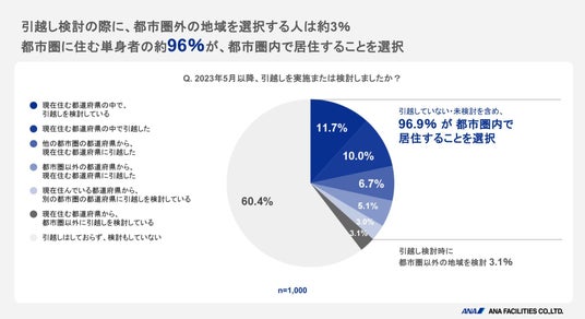 新型コロナウイルス感染症の位置づけが5類感染症に移行した2023年5月以降に、引越しの実施または検討の状況を尋ねたところ、約96%が都市圏に住む意向があることがわかりました。対して、都市圏外への移住を検討している人はわずか約3%。都市圏への人口集中を裏付ける結果となりました。