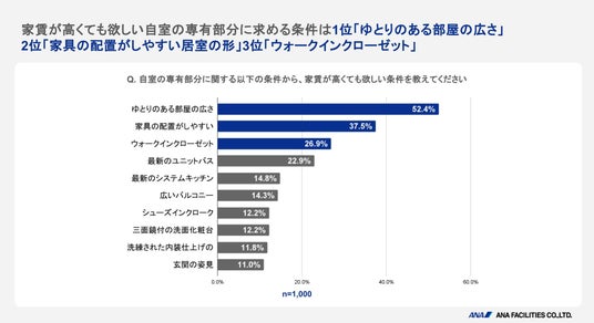■家賃が高くても欲しい自室の専有部分に求める条件は、1位「ゆとりのある部屋の広さ」2位「家具の配置がしやすい居室の形」3位「ウォークインクローゼット」