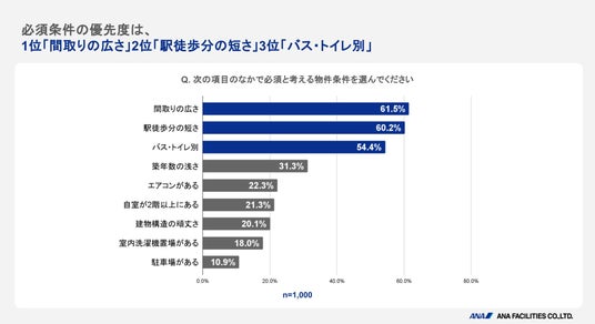■賃貸物件の必須条件は、1位「間取りの広さ」2位「駅徒歩分の短さ」3位「バス・トイレ別」