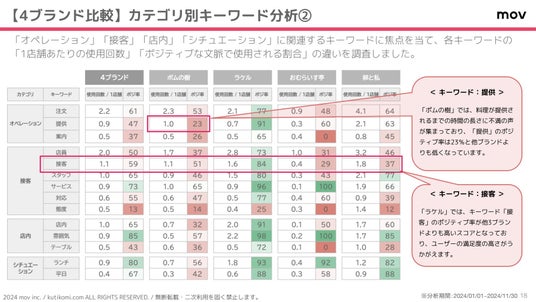 こちらの表では、「オペレーション」「接客」「店内」「シチュエーション」に関連するキーワードに焦点を当て、各キーワードの「1店舗あたりの使用回数」「ポジティブな文脈で使用される割合」の違いを調査しています。