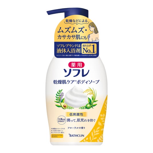 平日限定:女性浴室の洗い場(一部)に バスクリン【薬用ソフレ 乾燥肌ケアボディソープ】を設置!女性には特に気になる乾燥などによるムズムズ・カサカサ肌を、潤って肌荒れを防ぐ薬用ボディソープを期間限定で設置。うるおい成分を補い、しっとり肌に洗い上げ、生薬由来の有効成分が肌荒れ、にきびを防ぎます。
