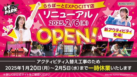 株式会社バンダイナムコアミューズメントが運営する屋内“ヤバすぎ”アクティビティ施設『VS PARK ららぽーとEXPOCITY店』は、5種の新アクティビティを投入し2025年2月6日(木)にリニューアルOPENします。
