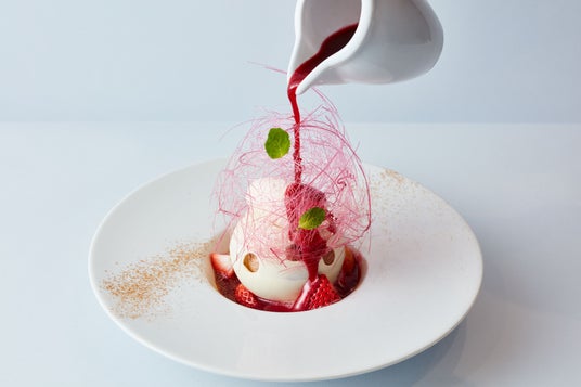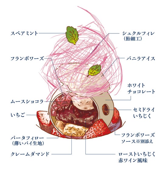 ホワイトチョコレートの中には、ベリー系のムースショコラとセミドライいちじくに、赤ワインが香る温かいローストいちじくが隠れています。シェフのこだわりのなめらかでひんやりとしたバニラアイスとハーモニーも絶妙。ラズベリーソースをかけて味の変化をお楽しみいただけます。