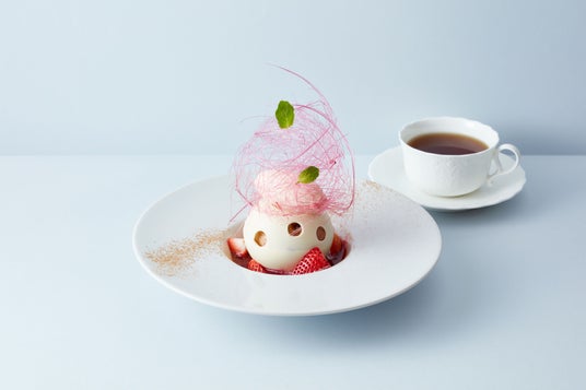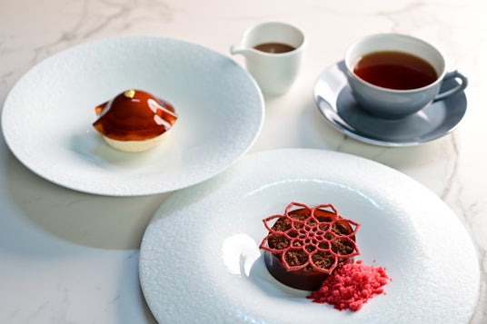 ※以下2つのメニューとドリンクのセット料金1皿目は、ベリーが香るショコラにフランボワーズやローズを合わせたスペシャリテ。2皿目のメレンゲの器に盛り付けたガナッシュコーヒーのビスキュイやアイスには、温かいショコラのソースをかけてお召あがりいただきます。