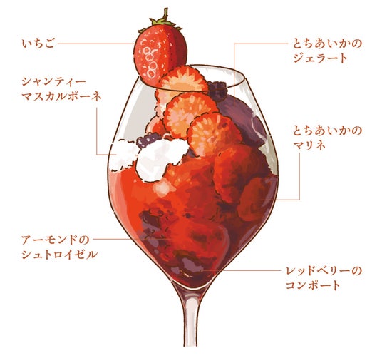 栃木県の「とちあいか」を堪能できるパフェ。レッドペリーのコンポートに、とちあいかのマリネとアーモンドのシュトロイゼル(粒状の生地)、クレームムショコラにシャンティーマスカルポーネ、とちあいかのジェラートを盛り付けました。可愛い焼き菓子もセットでお楽しみいただけます。