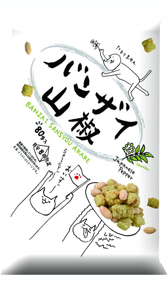 2018年発売のあられのお菓子。山椒のしびれがクセになるカリッと食感の小粒あられで、パッケージのネコのような生き物がバンザイをする、ゆるかわイラストがSNSで人気を呼び、山椒ブームの後押しもあってコアなファンを獲得しました。
