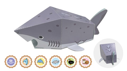 シロワニをモチーフにした立体的な箱から、当館の生き物たちがデザインされたビスケットがでてくる、当館オリジナル商品です。