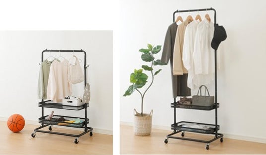 この度、コメリのオリジナルブランド「Athena Life(アテーナライフ)」から高さ調節ができる「高さが変えられるハンガーワゴン ブラック」を発売いたします。本製品は、使用するポールの本数を変えることで132cmと160cmに高さが変えられるので、大人用にもキッズ用にも活躍します。また、耐荷重5kgのバスケットが2つ付属しており、洋服だけでなくバッグや手袋など小物の収納にも便利です。走行性の高いキャスターで必要な時にはサッと移動することができます。