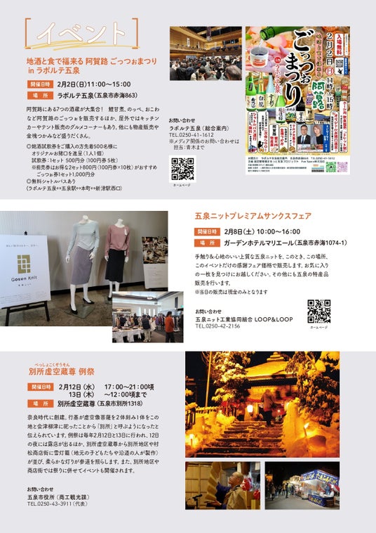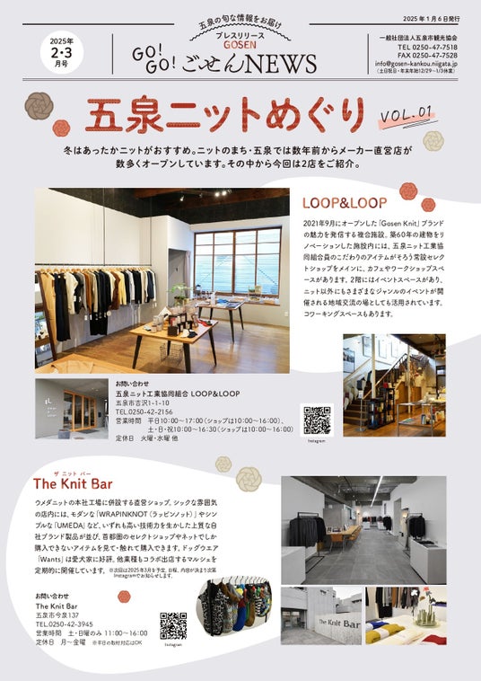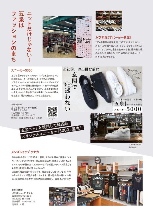 冬はあったかニットがおすすめ。ニットのまち・五泉では数年前からメーカー直営店が数多くオープンしています。ほかにも、純国産のスニーカーやニットイベント、ラーメン情報など、盛りだくさんの内容です。