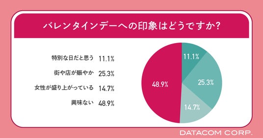 バレンタインへの印象を尋ねたところ、約半数にあたる48.9%の人が「興味ない」と回答。「街や店が賑やか」という回答も25.3%あるものの、特別な日として自分事の認識がある男性は少ないようです。
