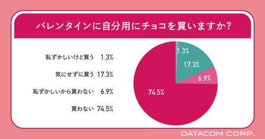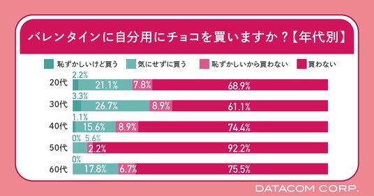 また、年代別に確認すると、30代が購入予定者の割合が最も高く、20代が続きました。20,30代の中には「恥ずかしいけど買う」と回答した人も数%おり、一部の若年層にとってバレンタインはチョコの自己消費の貴重な機会となっているようです。