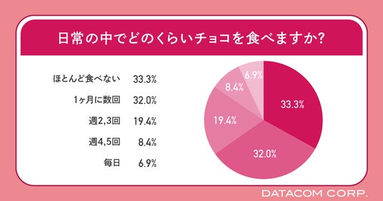 チョコを食べる頻度について聞いたところ、「ほどんど食べない」が33.3%、「1ヶ月に数回」が32.0%と6割以上の男性がチョコを食べる習慣がないということが分かりました。一方で、「週2,3回」19.4%、「週4,5回」8.4%、「毎日」6.9%と一定頻度でチョコを楽しむ層も確認されました。