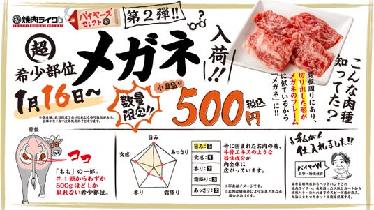 株式会社焼肉ライク(所在地:東京都港区、代表取締役:高橋尚也)が運営する「焼肉ライク」は、2025年1月16日(木)より、1頭の牛からわずか500gしか取れない希少部位「メガネ」を数量限定で販売いたします。「メガネ」は、濃厚な旨みと柔らかな食感を兼ね備えた、通常ではなかなか味わえない特別な部位です。今回の提供は、焼肉ライクのバイヤーが自信を持って厳選した商品をお届けする「バイヤーズセレクト」プロジェクトの第二弾です。焼肉ライクでは、一人でも気軽に楽しめる焼肉スタイルと、高品質な希少部位をリーズナブルに提供することで、新しい焼肉体験をご提案しています。今回の「メガネ」を通じて、希少部位ならではの特別な味わいをぜひご堪能ください。