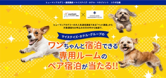 教育事業を展開するヒューマンアカデミー株式会社(本社:東京都新宿区、代表取締役:今堀健治、以下「当社」)は、国内有数のホテルグループである株式会社マイステイズ・ホテル・マネジメントとのコラボレーション企画を実施します。本企画では、当社の人気通信講座「ペット講座」の中から対象の講座を期間中にお申込みいただいた方に、抽選でマイステイズ・ホテル・グループのペット専用ルームのペア宿泊プランを8組様にプレゼントいたします。
